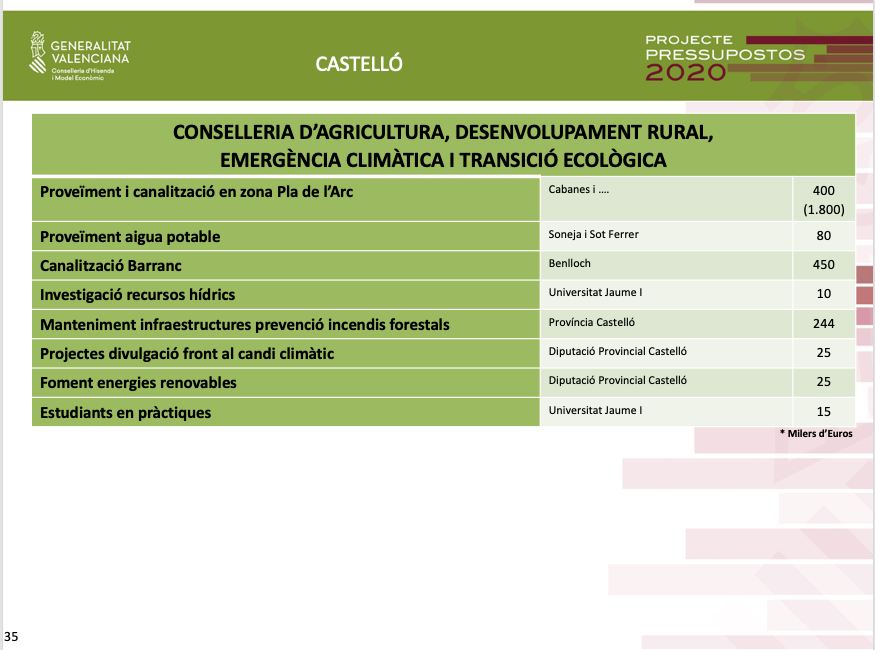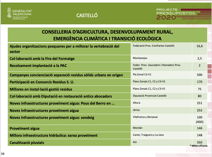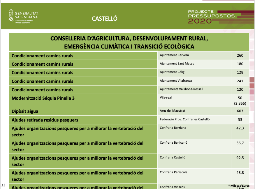 Quant a l'àrea d'Agricultura, Desenvolupament Rural, Emergència Climàtica i Transició Ecològica, els pressupostos preveuen destinar prop d'un milió d'euros en la reparació i condicionament de camins rurals de Cervera, Sant Mateu, Càlig, Vilafranca, Vallibona-Rossell.