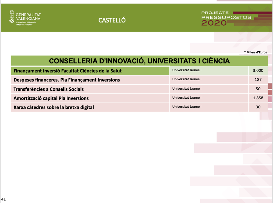 D'altra banda, cal destacar els 3 milions d'euros que es destinen del pressupost al finançament de les obres de construcció de la nova Facultat de Ciències de la Salut de la Universitat Jaume I.