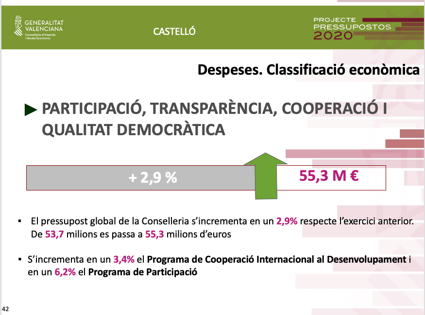 Finalment, les àrees d'Economia Sostenible i Participació centraran els seus esforços inversors en el reforç del creixement empresarial, el suport al sector comercial i a l'impuls del pla d'innovació i sostenibilitat d'aquest sector a la província de Castelló, així com a accions en matèria de formació i investigació, cooperació i desenvolupament sostenible, i foment de la transparència, el bon govern i la participació ciutadana.