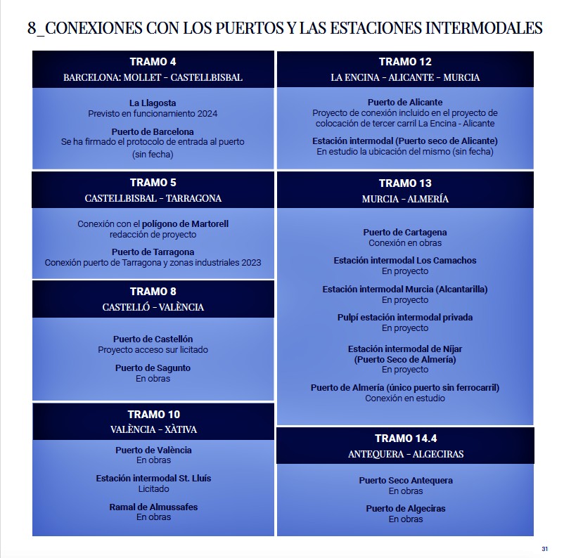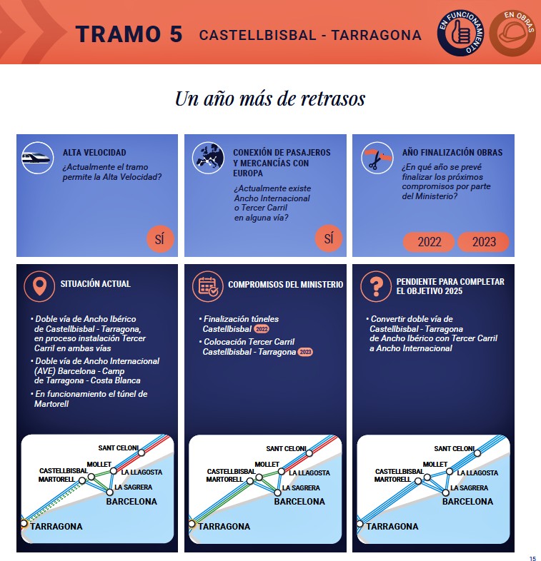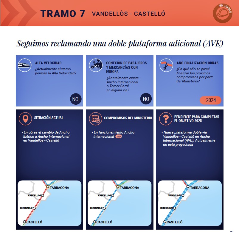 Los problemas comienzan en el tramo 6 que conectan Tarragona con Vandellós, y continúan en el Tramo 7 de conexión entre Vandellós y Castellón, donde el informe señala la inexistencia de Alta Velocidad, y de conexión con los nodos europeos con ancho de vía internacional. En la actualidad se desarrollan las obras para el ‘estrechamiento’ de la doble vía de ancho ibérico a ancho internacional que posibilitaría, en 2024, la conexión con Europa.
