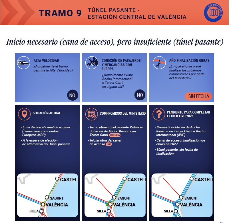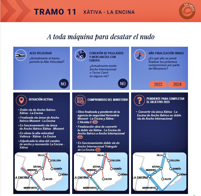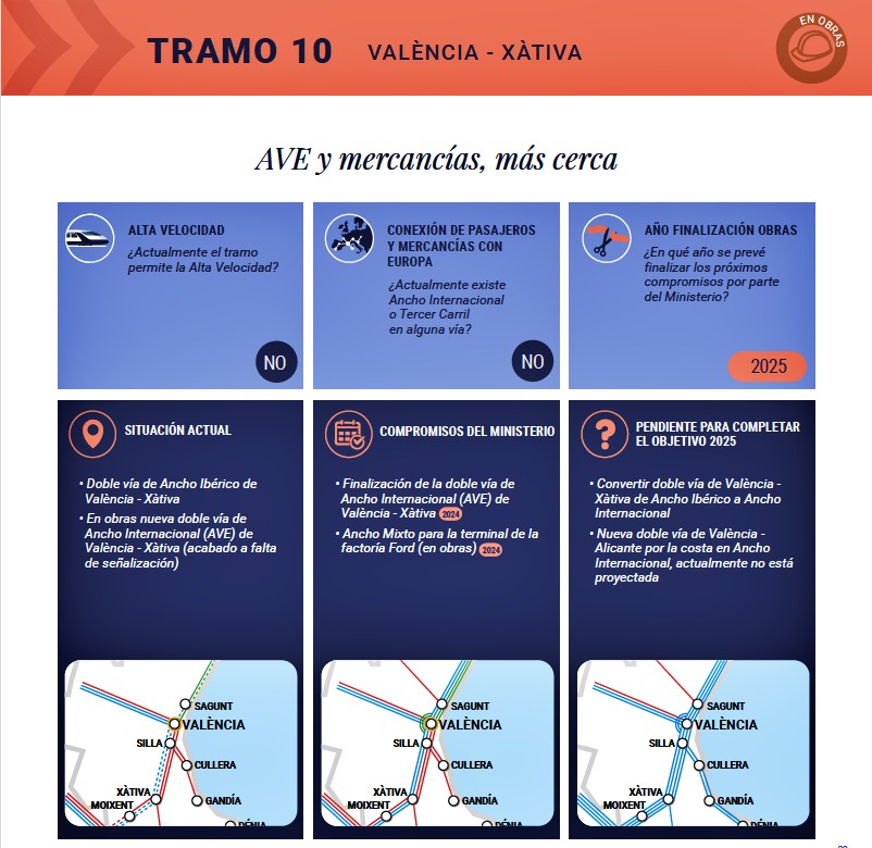 Los tramos 10, 11 y 12 se centran en la conexión ferroviaria entre Valencia, Xátiva y la Encina que no cuentan con alta Velocidad ni con conexión con Europa.