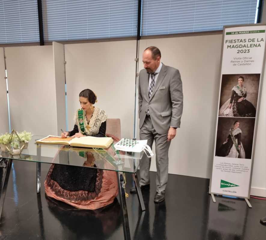 Las Reinas de la Magdalena 2023, Selena Tarín y Alejandra Sáez, acompañadas por las Damas de la Ciudad así como por miembros del Patronat de Festes, han visitado hoy El Corte Inglés de Castelló, donde han firmado los pergaminos y han recibido un obsequio como recuerdo de su visita.