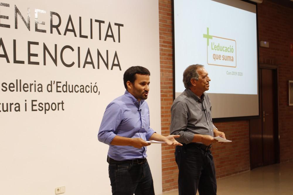 El conseller d'Educació, Cultura i Esport, Vicent Marzà, acompanyat pel secretari autonòmic d'Educació i Formació Professional, Miquel Soler, ha presentat el curs 2019-2020 amb el títol 'L'educació que suma'.