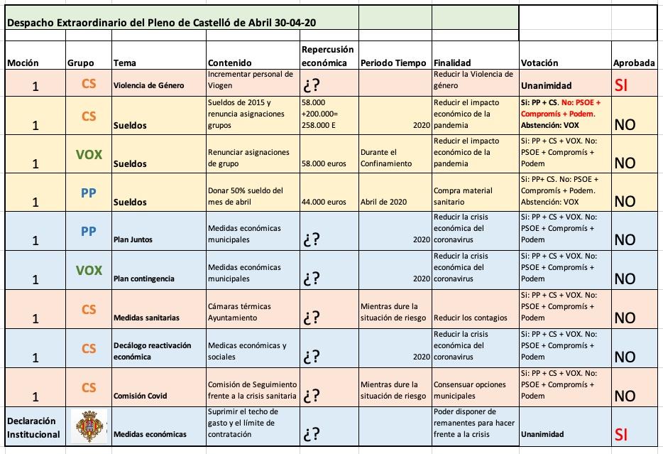 El equipo de Fadrell ha tirado por la calle de en medio con la reducción de los sueldos de los concejales; PSOE ha presentado su resolución que, indican, supondrá una rebaja global del 14%, pero sumando las aportaciones que hacen a su propio partido; y Podem y Compromís han pactado la suya de un 12% por tramos. Las mociones presentadas por PP, CS y VOX sobre los sueldos y el Covid se han rechazado. Aún así, el PP mantendrá la donación del 50% de su sueldo de abril y CS y Vox la asignación de grupo.