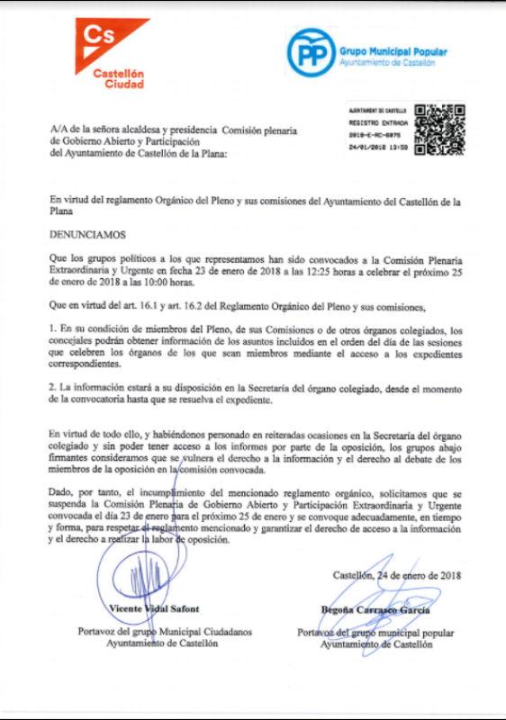 Concretamente, la denuncia, firmada por ambos grupos, enumeraban, como se puede ver en la fotografía, que la convocatoria urgente vulneraba el tiempo reglamentario que facilita a los grupos el acceso a la información del proyecto de presupuestos. Y por tanto, en virtud de este reglamento municipal, la imposibilidad de la oposición a realizar su labor de control del equipo de Gobierno.