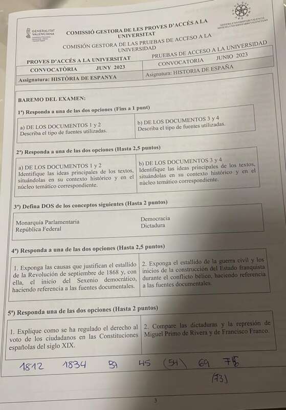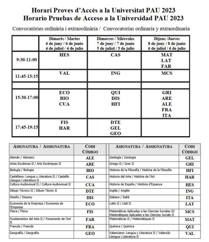 Durante la mañana de hoy también se realizará el examen de Valenciano, en horario de 11:45 a 13:15 horas, y por la tarde, a partir de las 15:30 horas, continuarán las pruebas. Hoy se han realizado dos de los cinco exámenes que constan en la fase obligatoria, Historia de España y Valenciano, mañana los estudiantes se examinarán de Castellano (09:30-11:00) e Inglés (11:45-13:15). Por último, el viernes por la mañana será el turno de la troncal de modalidad, ya sea Matemáticas, Matemáticas Aplicadas a las Ciencias Sociales, o Latín. El estudiantado también puede presentarse, en una fase voluntaria, a un máximo de cuatro asignaturas distintas para aumentar su calificación de admisión hasta un máximo de 14 puntos. Estos exámenes se realizan todos en horario de tarde.