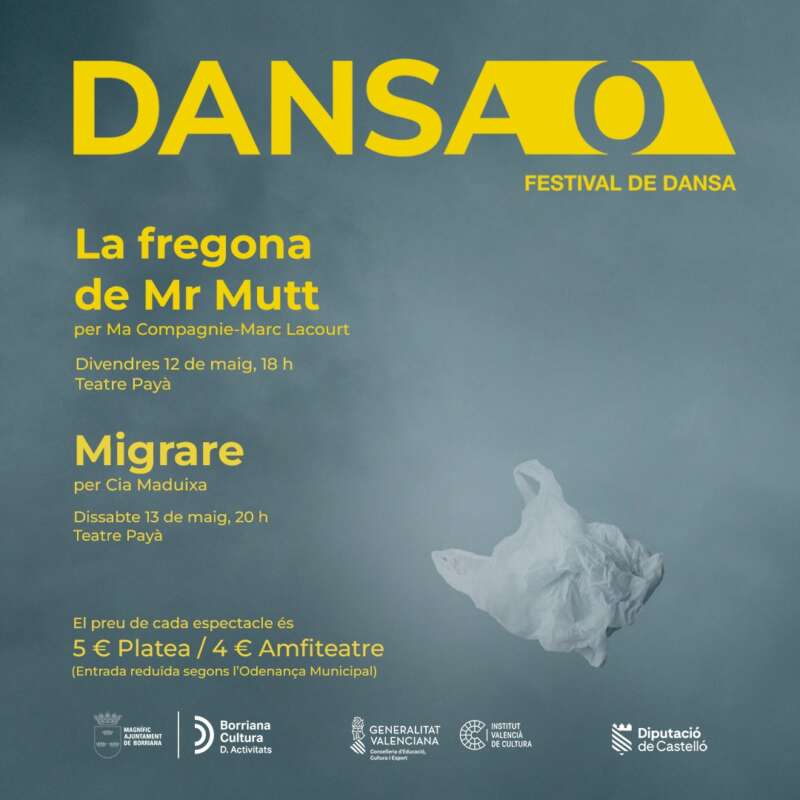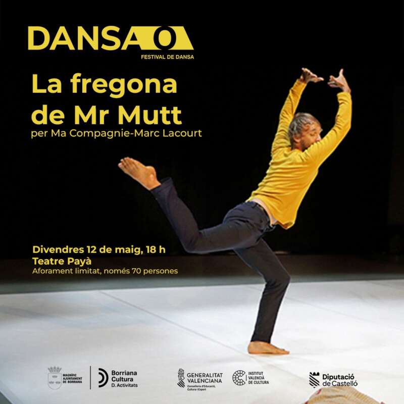 En primer lloc, el divendres 12 de maig a les 18h al Teatre Payà, tindrà lloc la representació de La serpillère de Monsieur Mr. Mutt (El pal de fregar del Sr. Mutt) de DT. Compagnie - Marc Lacourt, una obra dirigida a la primera infància, a partir dels 3-4 anys que mostra a través de la dansa una apassionant història sobre la possibilitat dels objectes quotidians de transformar-se en obres d'art.