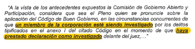 De hecho, el Código de Buen Gobierno no diría tal cosa y se estaría sometiendo a debate de que el mero hecho de que se presente una querella no es razón para que se pida el cese del concejal afectado. Otra cosa muy distinta, es que se aplique cuando se abra un proceso de instrucción o investigación por parte del Juzgado. No es que haya una querella, es que hay una instrucción. No se pide la aplicación el Código por una querella, que se pueden presentar muchas, sino porque el titular del juzgado la ha admitido a trámite e inicia una instrucción al percibir que puede haber indicio de delito.