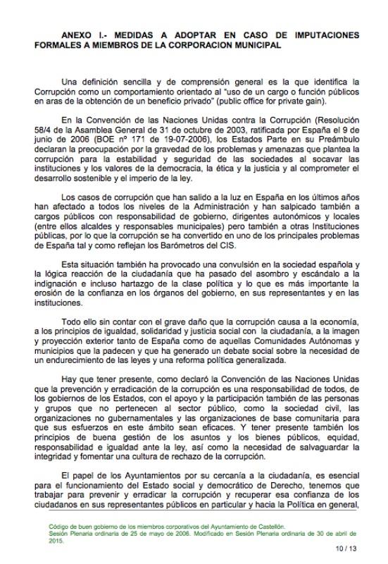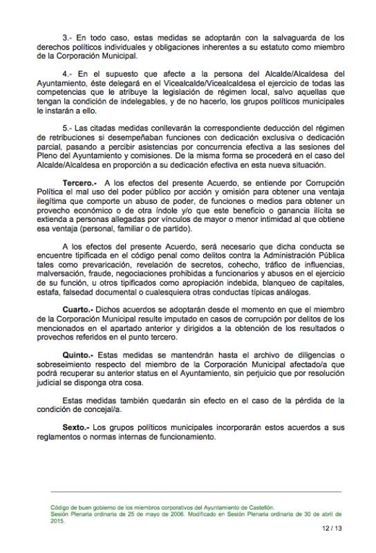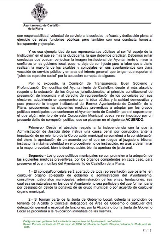 “De la Sra. Secretara General del Pleno asesoramiento legal que informe de si de la documentación aportada se desprende que se dan las circunstancias establecidas en el “Código de buen Gobierno de los miembros corporativos del Ayuntamiento de Castellón” aprobado por el pleno de este Ayuntamiento, por unanimidad de todos sus miembros en su sesión ordinaria celebrada el 30 de abril de 2015, y que la Sra. Brancal suscribió al comienzo del mandato en señal de aceptación de su contenido, para que resulten de aplicación las medidas previstas en el Anexo I y, concretamente, el que sea apartada de toda representación que ostente en cualquier órgano colegiado de gobierno o administración del Ayuntamiento, consultivos, Patronatos Municipales, o administración de los entes, fundaciones, sea cual sea su naturaleza en los que el Ayuntamiento participe y del que forme parte por designación del portavoz de su grupo municipal o por acuerdo de cualquier órgano municipal; así como revocadas inmediatamente por la alcaldía o Junta de Gobierno Local las delegaciones que ostente por su condición de vice alcaldesa o Teniente de Alcalde Concejal delegado de área de Gobierno o cualquier otra delegación general o especial de funciones”.