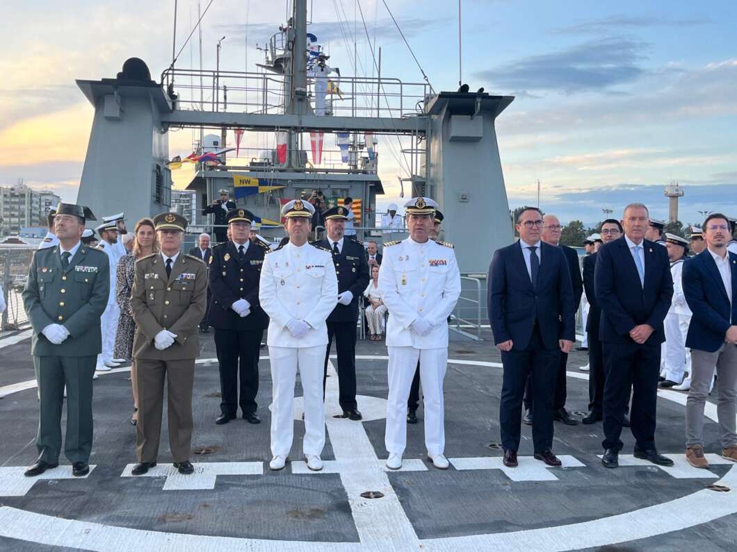 El patrullero Alborán de la Armada Española ha recalado en el puerto de Castellón con motivo del Día de la Fiesta Nacional. Durante este evento, se ha llevado a cabo un solemne arriado de bandera, al que han asistido destacadas autoridades locales.