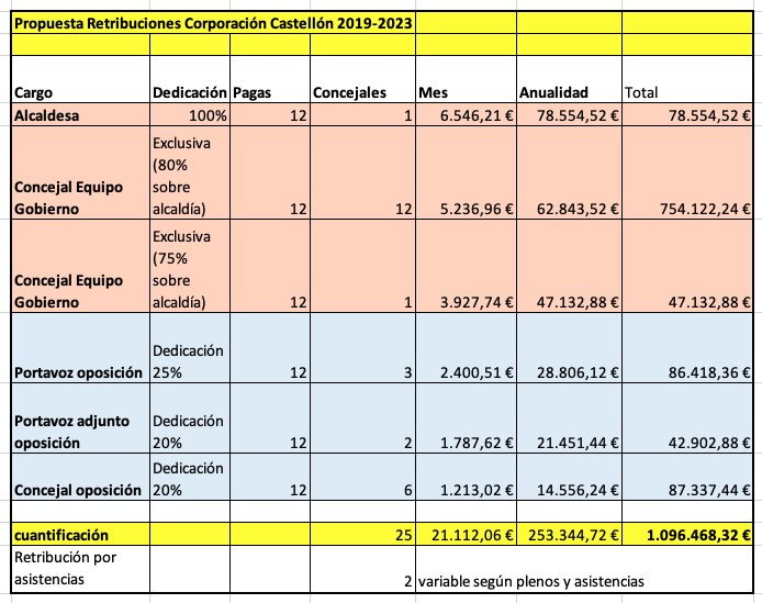 La cuantía total de esos gastos en sueldos para los concejales, ya a primera vista es más alta ahora que con la propuesta de la semana pasada, aunque el coste exacto deberá calcularse a final de año en función a las variables por asistencias.