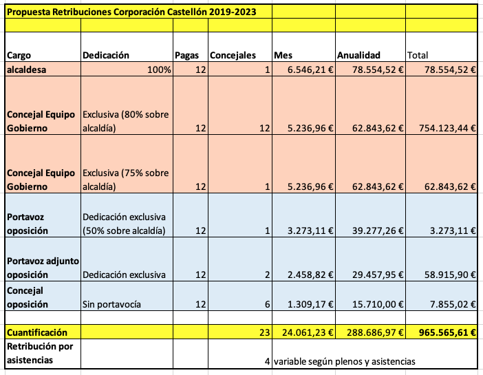 Con la propuesta aprobada hoy, Los concejales de la oposición, tanto los portavoces como los portavoces adjuntos y los que no tienen delegaciones ven reducido su sueldo, pero los portavoces de CS y VOX pueden acogerse a la dedicación parcial del 25% que ya no es incompatible con su trabajo. De esta forma, el coste fijo anual de los sueldos de los concejales asciende a 1.096.468,32 euros. Pero se reducen los costes variables a solo dos concejales que cobrarán por asistencias: Patricia Puerta y Vicent Sales, ya que cobran el sueldo íntegro como vicepresidenta y portavoz de grupo en la Diputación Provincial.
