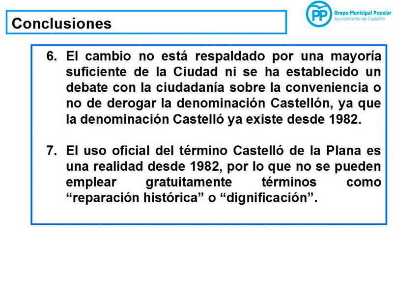 6.- Y el sexto de los argumentos del gobierno es que la eliminación del topónimo bilingüe responde a un clamor popular. “Según Compromís hay un clamor popular favorable al cambio y el uso de la denominación Castelló, es aplastante en los usos comerciales y cotidianos, y vuelve a ser falso. Se ha visto por la escasa o nula asistencia a las conferencias programadas por el gobierno local. En la actualidad el uso de la denominación Castellón está muy extendida y coexiste en total normalidad con la denominación Castelló”.