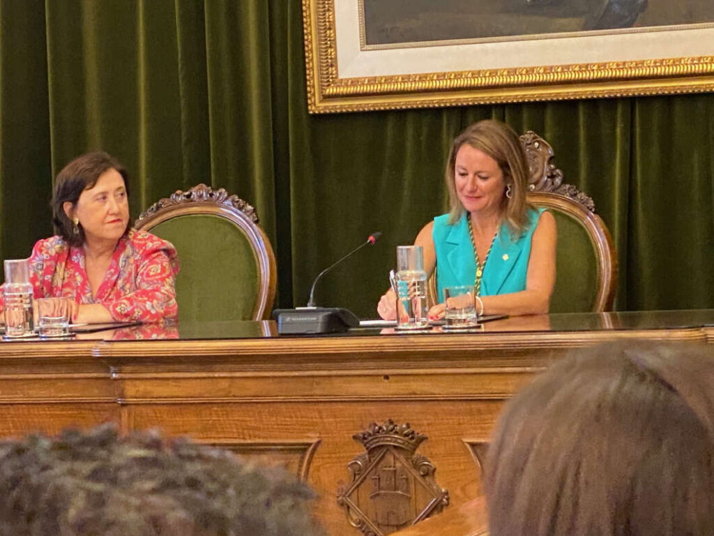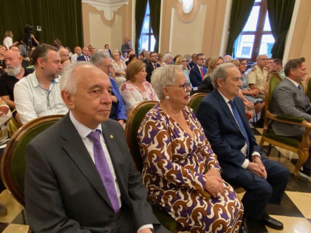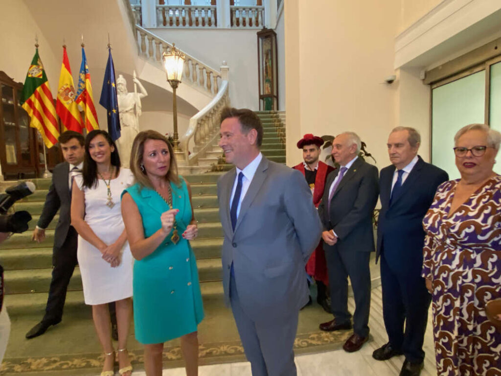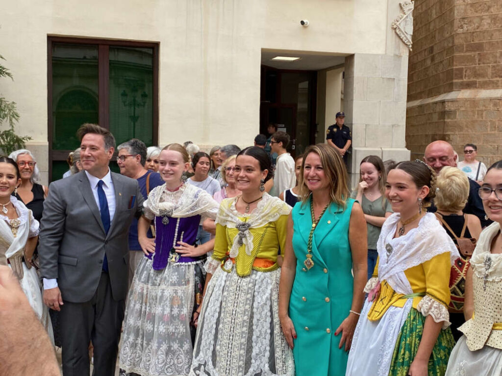 Llegaron los destinatarios de las medallas de oro de la ciudad: La viuda de Pepín Marco, la Filarmónica y la Cofradía de la Sangre, que fueron recibidos en la entrada del edificio consistorial por la alcaldesa de Castelló, Begoña Carrasco y la concejal de Cultura, María España.