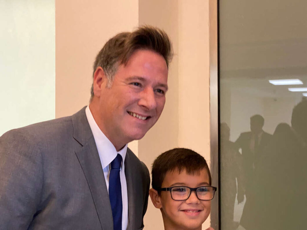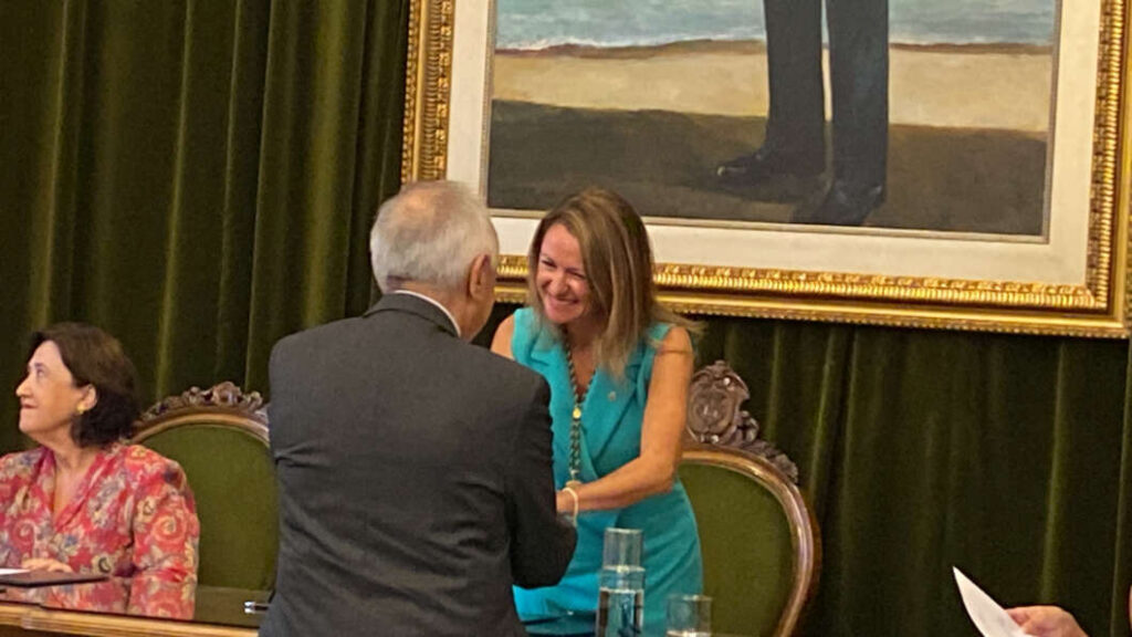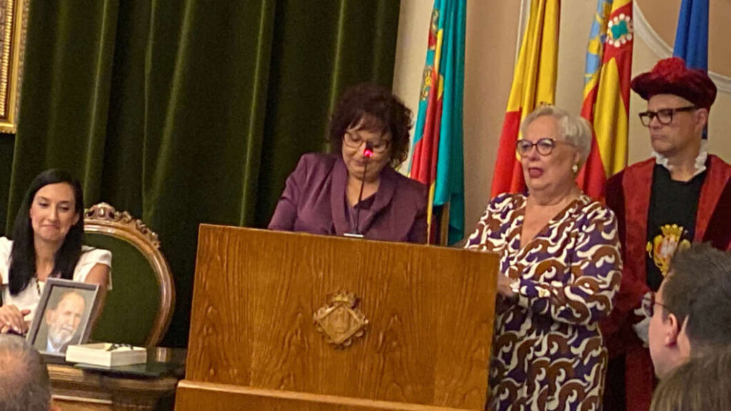 A continuación, Carlos Latre se levantó, acudió al punto donde lo esperaba la alcaldesa y recibió el nombramiento enmarcado que lo convierte en Hijo Predilecto de Castelló. El salón estalló en aplausos.