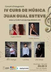 El pròxim diumenge dia 3 de juliol a les 20:00 hores al Racó de l’Abadia tindrà lloc l’inici del IV Curs de Música Juan Gual Esteve, amb el concert que oferiran Eugenia Moliner, Cristina Romero, Denis Azabagic, Luis Arias i Júlia Gállego. Interpretaran obres de Quantz, Moreno Torroba, Scarlatti, Mahler, Poulenc i Marais. El concert serà gratuït i no caldrà fer reserva prèvia per a accedir.