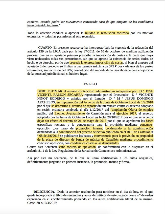 Revés para el Ayuntamiento de Castellón en los juzgados. El Juzgado de lo Contencioso Administrativo ha fallado a favor del subdirector de la Banda Municipal, y anula el procedimiento del Ayuntamiento, que dejó sin efecto las bases de contratación del 2015, y sacó adelante la oposición abierta que derivó en la contratación de Marcel Ortega. La sentencia no es firme y cabe recurso, pero hoy por hoy señala, que Ramón Segarra tenía derecho a poder acceder a la plaza de director mediante una oposición de promoción interna, que el Ayuntamiento no respetó.