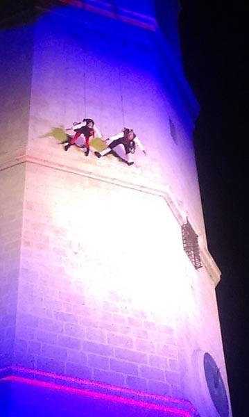 Sonaron entonces las campanas de El Fadrí, y desde lo más alto se deslizaron otros danzarines, ataviados con el traje regional, para bailar sobre la pared de ‘el soltero’, el querido Fadrí. El y ella, romance de amor y ternura para un Fadrí solitario que se sabe todas las andanzas de la ciudad.