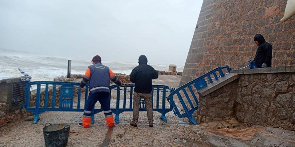 A causa del viento, han caído dos cipreses al Cementerio Municipal y cuatro árboles al casco urbano, y ya se trabaja para retirarlos. Además, también se están empezando a retirar restos vegetales y arena de las zonas más afectadas, las playas de la Mar Xica y la Caracola. Por último, también se están vaciando tres islas de contenedores sepultados que se han inundado.