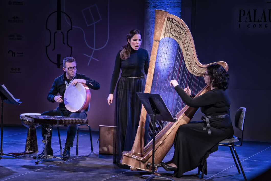 El grupo, formado por la voz de Quiteria Muñoz y el arpa de Úrsula Segarra, acompañados en esta ocasión por la percusión de Onofre Serer, presenta en el claustro del Museu de Belles Arts de Castelló ‘Anemocoria’, su tercer trabajo discográfico. Se trata de un proyecto en el que, a través de la música y la palabra, transitan por un amplio repertorio de canciones de diferentes épocas y lugares del mundo.