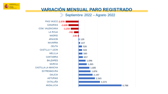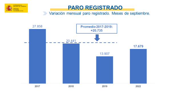 En total, las listas del desempleo registraron en septiembre en toda España es de 2.941.919 personas, la cifra más baja en un mes de septiembre desde 2008, pero cerca de la cota psicológica de los 3 millones de parados que se había logrado batir con holgura tras el empuje de las contrataciones previas a la temporada estival. En términos interanuales, respecto a septiembre de 2021, el paro ha descendido en 315.883 personas (-9,70%).