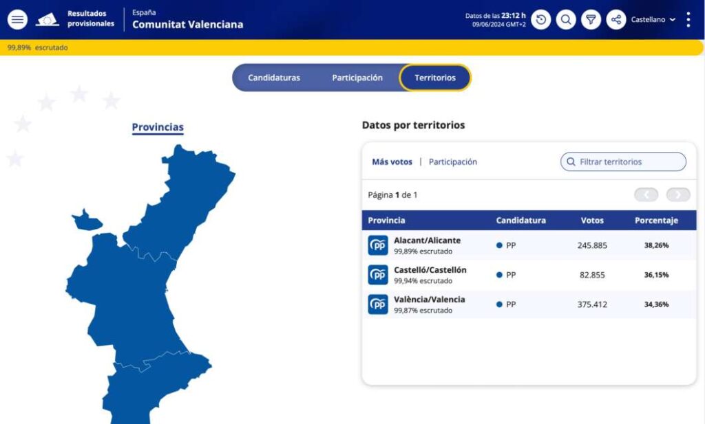 En la Comunitat Valenciana el PP ha ganado en las tres provincias, al conseguir el 35,85% de los votos, sobre el PSOE, que ha sumado el 31,41 % y VOX, que se sitúa también en tercera posición con el 11,51% de los votos.