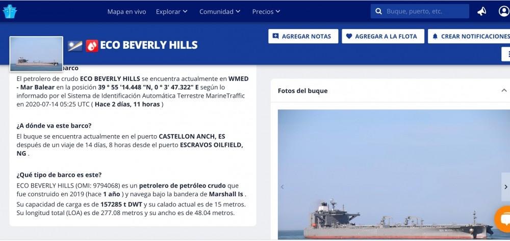 El Eco Beverly Hills, es un buque petrolero de 277 metros de eslora (longitud), 48 metros de manga (ancho) y 15 metros de calado (profundidad de su estructura bajo el agua), que se encontraría situado en la zona de boyas donde tradicionalmente los barcos descargaban el combustible con destino a la Refinería de Castellón.