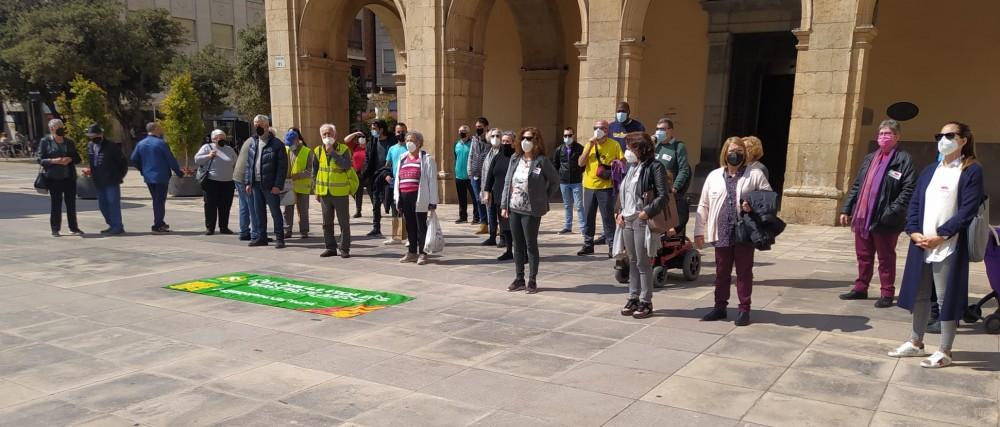 Mientras se celebraba el pleno, telemático, una treintena de personas se manifestaba en la plaza Mayor de Castelló en defensa de la moción presentada por Podem.