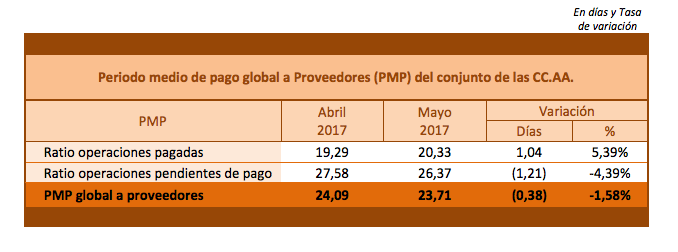 El Periodo Medio de Pago a Proveedores (PMP) del mes de mayo se ha situado en 23,71 días para el conjunto de las Comunidades Autónomas, lo que supone una leve disminución de 0,38 días con respecto al mes anterior, un 1,58%. La variación del PMP se debe fundamentalmente a la subida de 1,04 días en la ratio de operaciones pagadas, pasando de 19,29 días a 20,33; así como a la disminución en 1,21 días en la ratio de operaciones pendientes de pago, variando de 27,58 a 26,37 días.