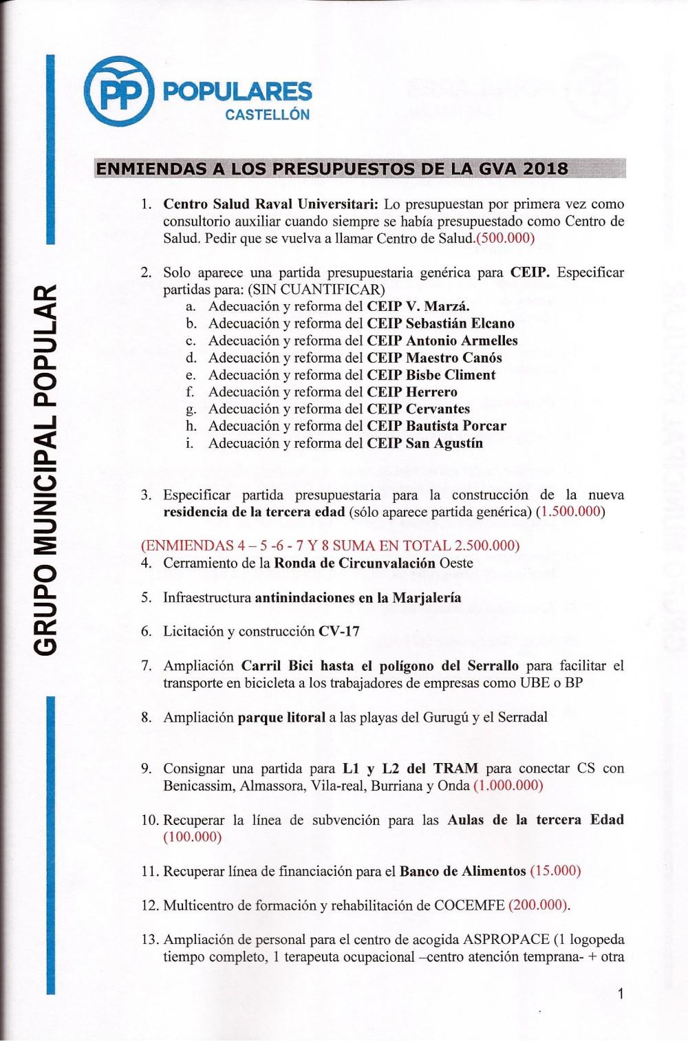 “Demandamos más inversión para obras antiinundaciones en la Marjalería; la ampliación del carril bici hasta el polígono del Serrallo para facilitar el transporte en bicicleta a los trabajadores de empresas como UBE o BP; la ampliación del Parque Litoral a las playas del Gurugú y el Serradal; consignar una partida para L1 y L2 del Tram para conectar Castellón con Benicassim, Almassora, Vila-real, Burriana y Onda; la ampliación del carril bici desde la rotonda de la silla hasta la rotonda frente al Hospital General y una Tourist info en la estación de Castellón”.