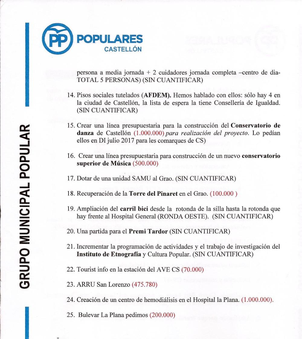 Según ha declarado Carrasco: “Son actuaciones demandadas por la propia ciudad de Castellón -que hemos ido recogiendo a través de nuestra Ruta Ciudadana-, con las que pretendemos paliar el ninguneo y la ausencia de proyecto de ciudad de quienes nos gobiernan. Proponemos más de 9 millones de euros más, frente a los 4,4 millones de euros irrisorios que nos asignó el Consell de Puig y Oltra”.