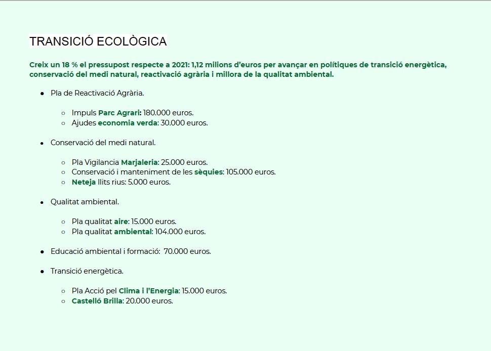 En el Plan de Reactivación Agraria contempla partidas, entre otras, para dinamizar el Parc Agrari y promover ayudas para proyectos agroecológicos; en conservación del medio natural, el Plan de Vigilancia de la Marjaleria; en calidad ambiental, el Plan de Mejora de Calidad del Aire; y en transición energética, el Plan de Acción por el Clima y la Energía y el programa de ahorro energético en escuelas de Castelló Brilla.