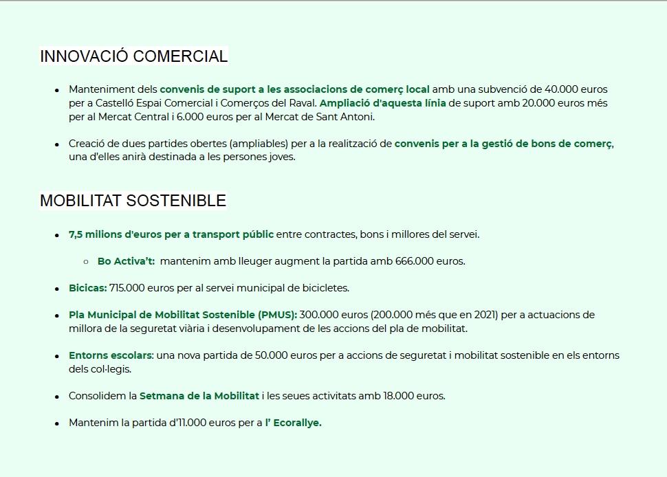 Donate ha apuntado también que el presupuesto “mantendrá los convenios de apoyo a las asociaciones de comercio local con una subvención de 20.000 euros para Castelló Espai Comercial y otros 20.000 para Comerços del Raval, y se ampliará esta línea con otros 20.000 euros para el Mercado Central y 6.000 para el Mercado de Sant Antoni”.