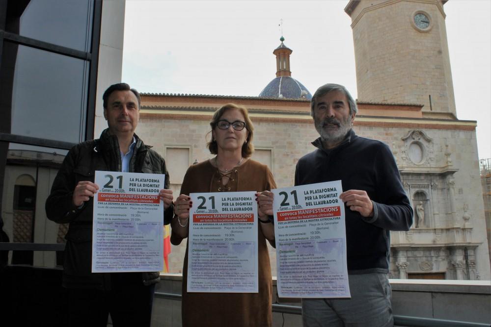 L'alcaldessa de Borriana, Maria Josep Safont, el regidor d'Agricultura, Vicent Garcia, i el representant de la Cooperativa Agrícola, Juanvi Moros animen a una participació massiva en la manifestació de dilluns