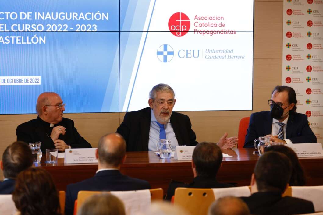 "A partir de la unidad básica de socialización que es la familia, el sistema educativo adquiere una gran relevancia para el crecimiento del ser humano, por lo que hemos de postular de él estabilidad y poca perplejidad, lo contrario de lo que hemos vivido en nuestro país en los últimos cuarenta años, con innumerables reformas educativas". Así lo ha afirmado esta mañana Vicente Navarro de Luján, rector de la Universidad CEU Cardenal Herrera, durante la inauguración del curso 2022-2023 en el campus de Castellón. Un acto académico que ha sido precedido por una eucaristía oficiada por el obispo de Segorbe-Castellón, Casimiro López.