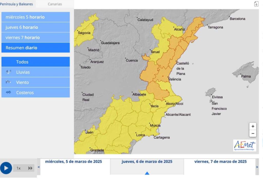 Según la Agencia Estatal de Meteorología, las provincias de Castellón y parte de Valencia se mantienen durante la jornada de mañana en situación de alerta naranja por acumulaciones de agua. La de Alicante pasará a situación normal, verde, a partir de las 09:00h de la mañana. Para el viernes, la Aemet mantiene la alerta amarilla en el interior centro y norte de la provincia de Castellón y litoral norte.