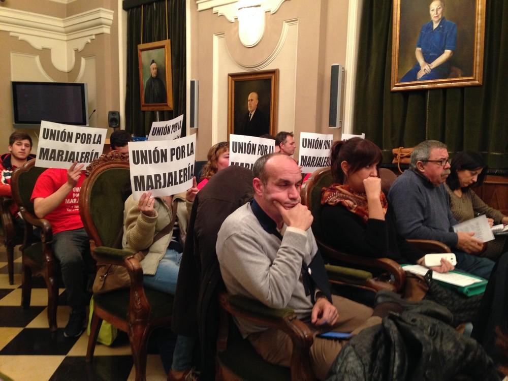 El colectivo de Unión por la Marjalería inundó el salón de plenos en sus inicios. Protestaron en silencio con pancartas donde se pronunciaban en contra de los derribos y se retiraron antes del debate del presupuesto.