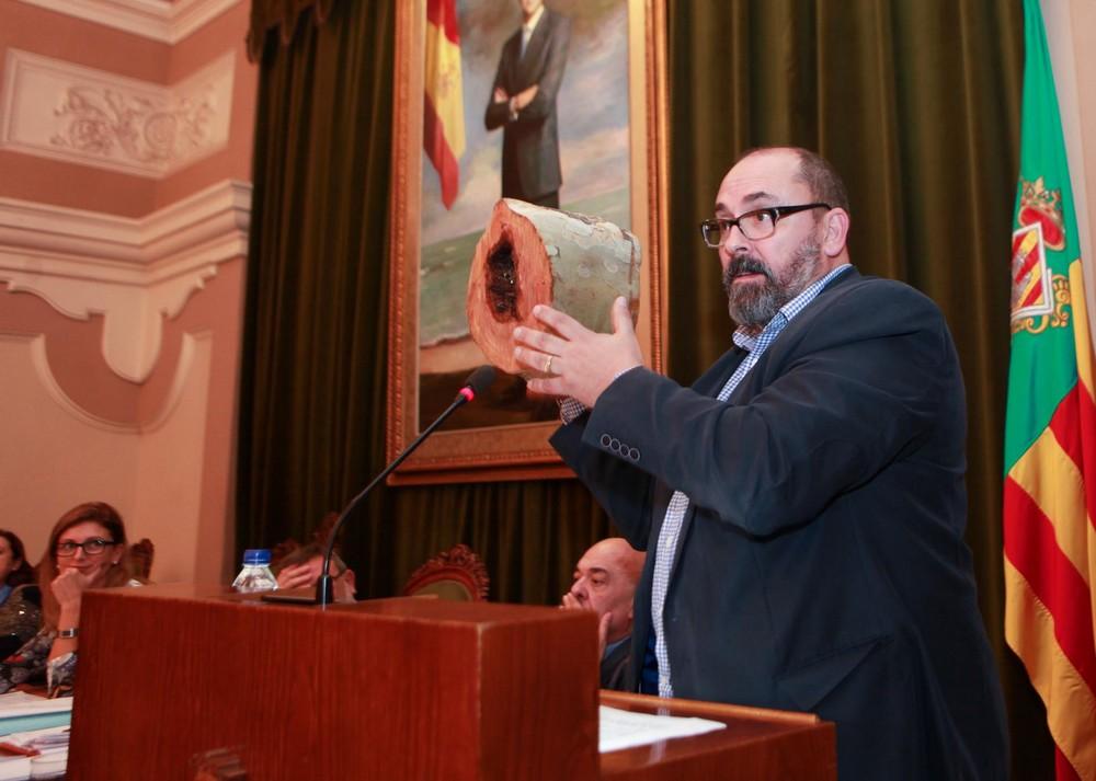 El vicealcalde levanta un tronco hueco en el pleno para mostrar el estado de los árboles del Parque Ribalta