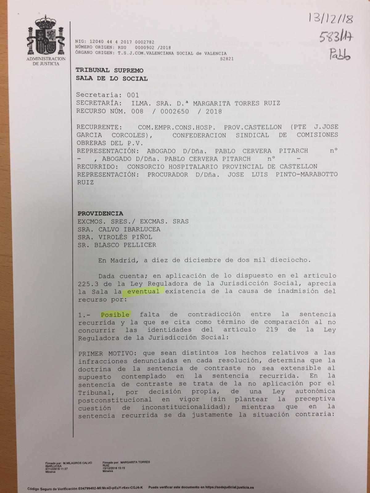 "La sala de lo social del Tribunal Supremo ha inadmitido el recurso presentado por CCOO sobre la equiparación de las retribuciones del personal del Hospital Provincial de Castellón a la del resto de trabajadores de la Conselleria de Sanitat Universal i Salut Pública.