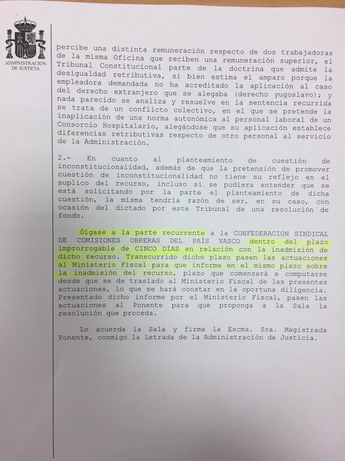 Pero el comunicado del Consorcio resulta, cuanto menos, inexacto, ya que, según la providencia del tribunal, a la que ha tenido acceso Castellón Información, el Supremo no da por cerrado el caso, y mantiene el proceso judicial por el que abre un plazo de 5 días a CCOO para que presente sus alegaciones, tal como se muestra en las siguientes fotografías de la providencia.