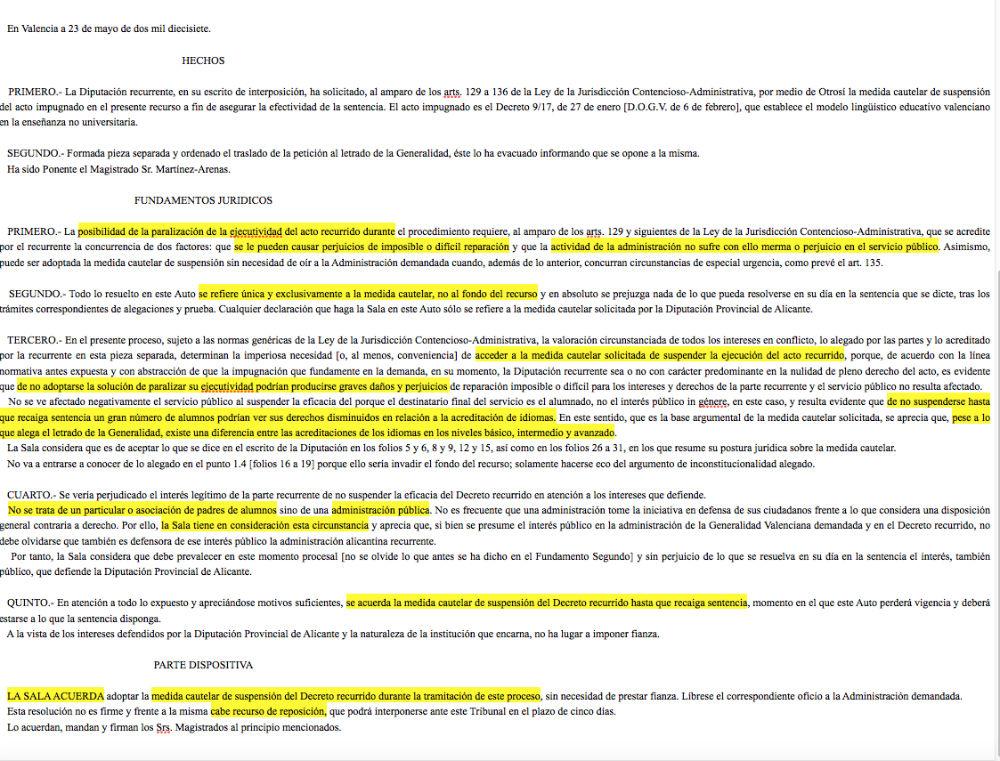La Sección 4ª de lo Contencioso Administrativo del Tribunal Superior de Justicia de la Comunidad Valenciana, ha estimado la petición de la Diputación de Alicante y suspende cautelarmente el decreto que establece el modelo lingüístico educativo valenciano en la enseñanza no universitaria.