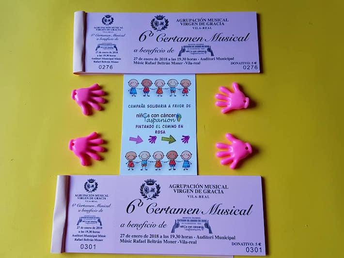 Les entrades ja estan a la venda en diversos comerços de Vila-real, per un preu de cinc euros, que es destinaran íntegrament a Aspanion per a seguir contribuint a millorar l'estat mèdic, existencial, psicològic i social dels xiquets afectats per càncer i també dels seus pares i familiars, treballant perquè el seu desenvolupament emocional, afectiu i educatiu siga el més adequat a les seues especials circumstàncies.