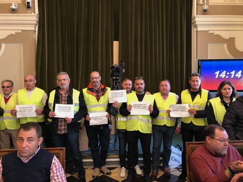 Comenzaba la lectura de los puntos, pero la tranquilidad duró poco, porque los agentes del GIP, ya en la calle, en la plaza del Mercadillo, donde recaen las ventanas del salón de Plenos, comenzaron su protesta sonora, con pitos y trompetas.
