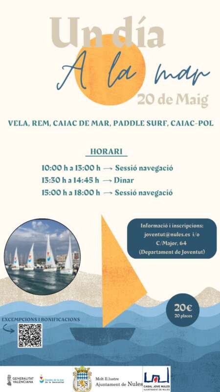 ‘Un dia a la mar’ s’anomena la jornada amb la qual els joves de Nules podran gaudir de diferents activitats aquàtiques a l’Escola de la Mar de Borriana, en concret podran practicar vela, rem, caiac de mar, paddle surf i caiac-pol.