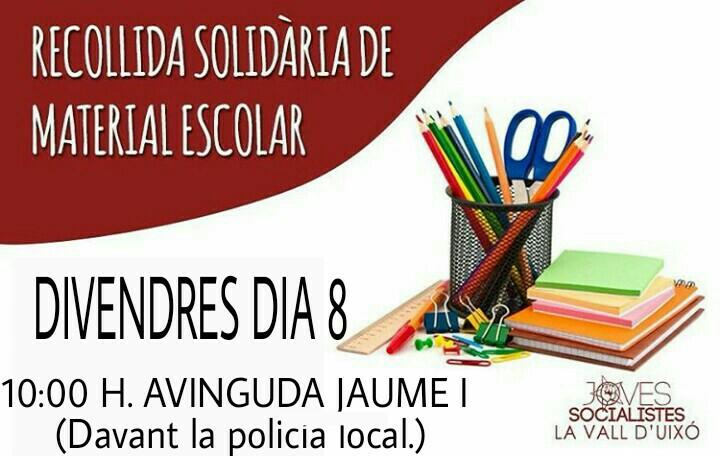 Joves Socialistes de la Vall d'Uixó ha organizado una recogida solidaria de material escolar mañana, viernes 8 de septiembre, con la instalación de un estand de 10.00 a 13.00 horas en la avenida Jaume I (enfrente de las dependencias de la Policía Local). Todo lo recogido se entregará a Cruz Roja, que lo repartirá entre las familias que lo necesitan.