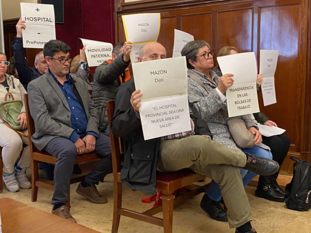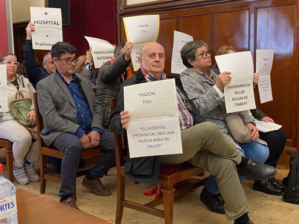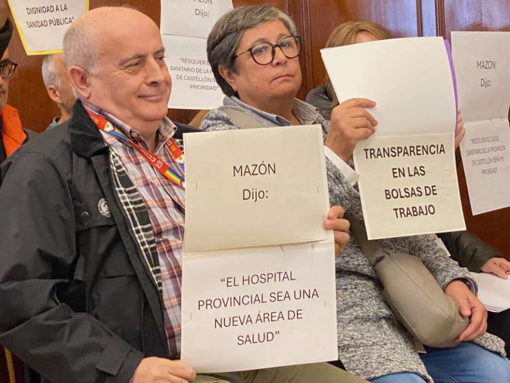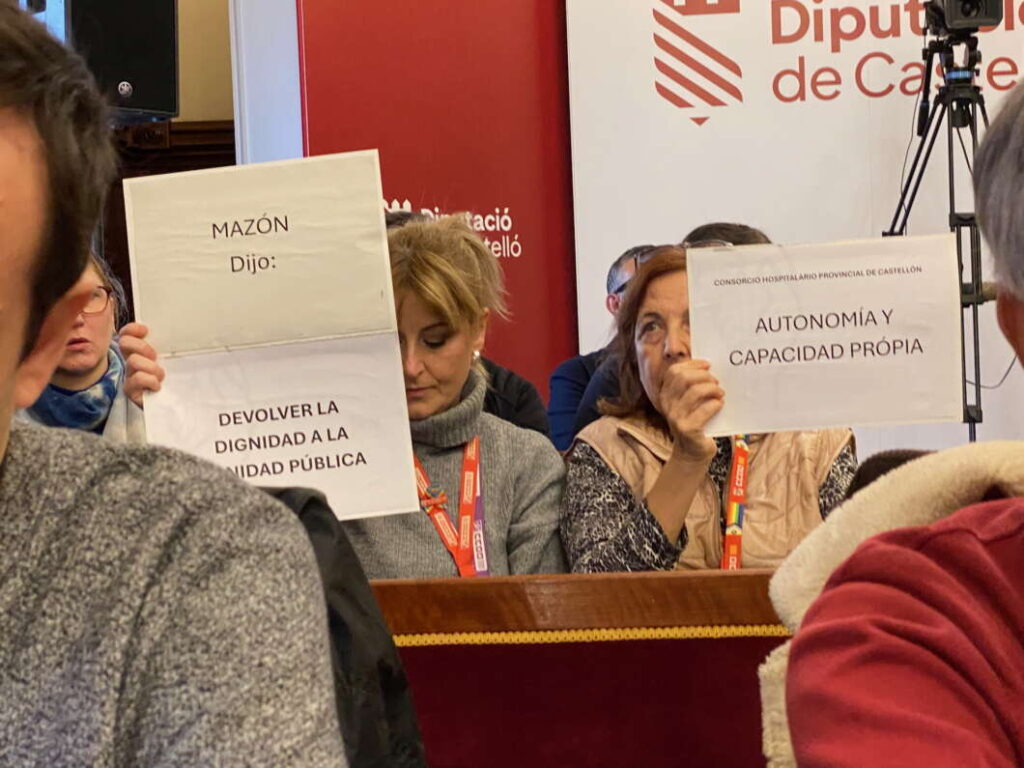 En l'espai del públic s'han manifestat representants sindicals de CCOO i d'UGT per a protestar per la situació de l'Hospital Provincial i en contra del que estimen que és un incompliment de les promeses de Mazón.