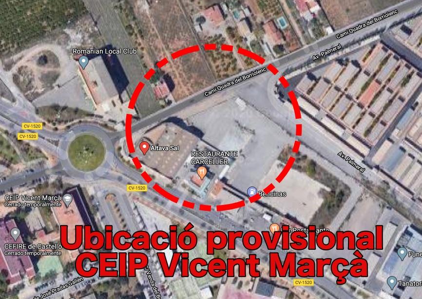 Més senzilla és l'actuació en la futura ubicació temporal del Vicent Marçà, a la quadra Borriolenc, al costat de la CV-1520. En aquest cas, el pressupost base de licitació és de 53.000 euros i els treballs duraran 28 dies. Ací únicament és necessari netejar l'espai llogat pel consistori i garantir que les canalitzacions i les preses de corrent i aigua per al centre provisional funcionen correctament.