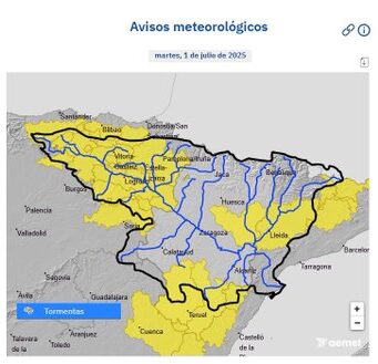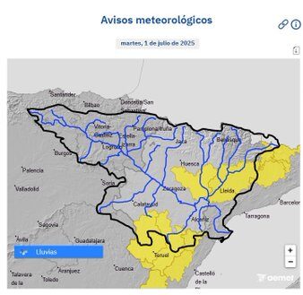 La Confederación Hidrográfica del Ebro alerta de la posibilidad de crecidas súbitas de cauces menores y barrancos dentro de parte de la mitad oriental de la cuenca del Ebro, en Aragón (Teruel), Cataluña (Lleida) y Comunidad Valenciana (Castellón).
