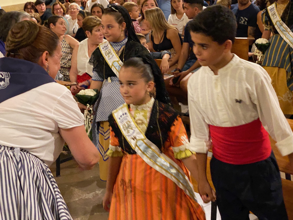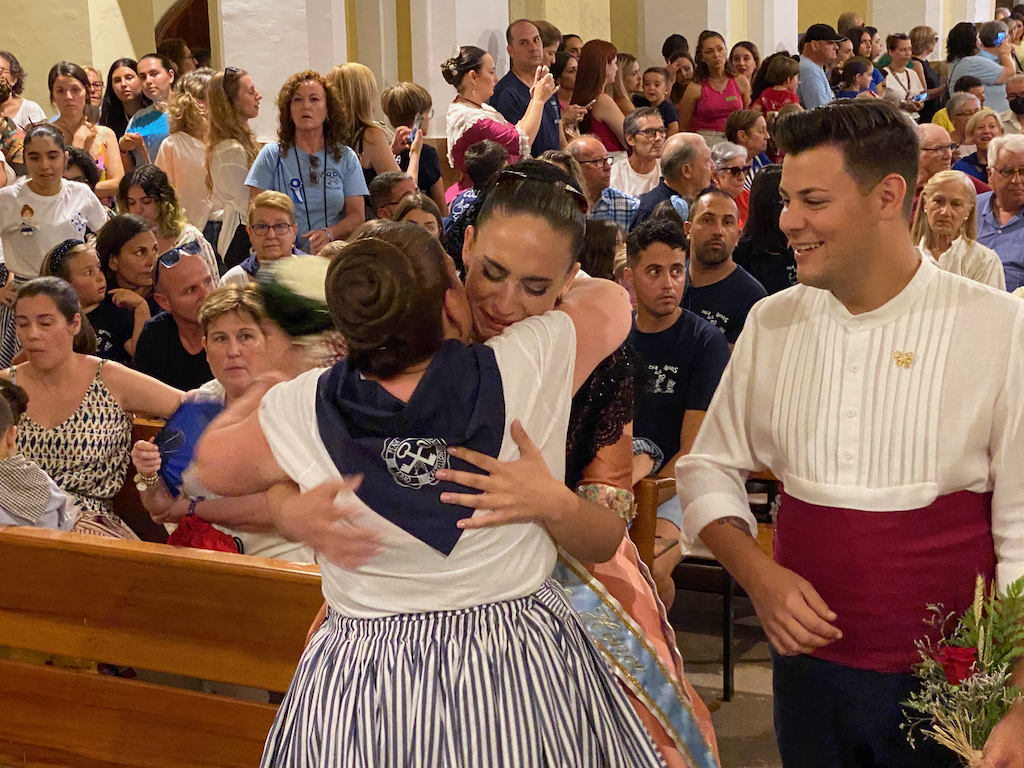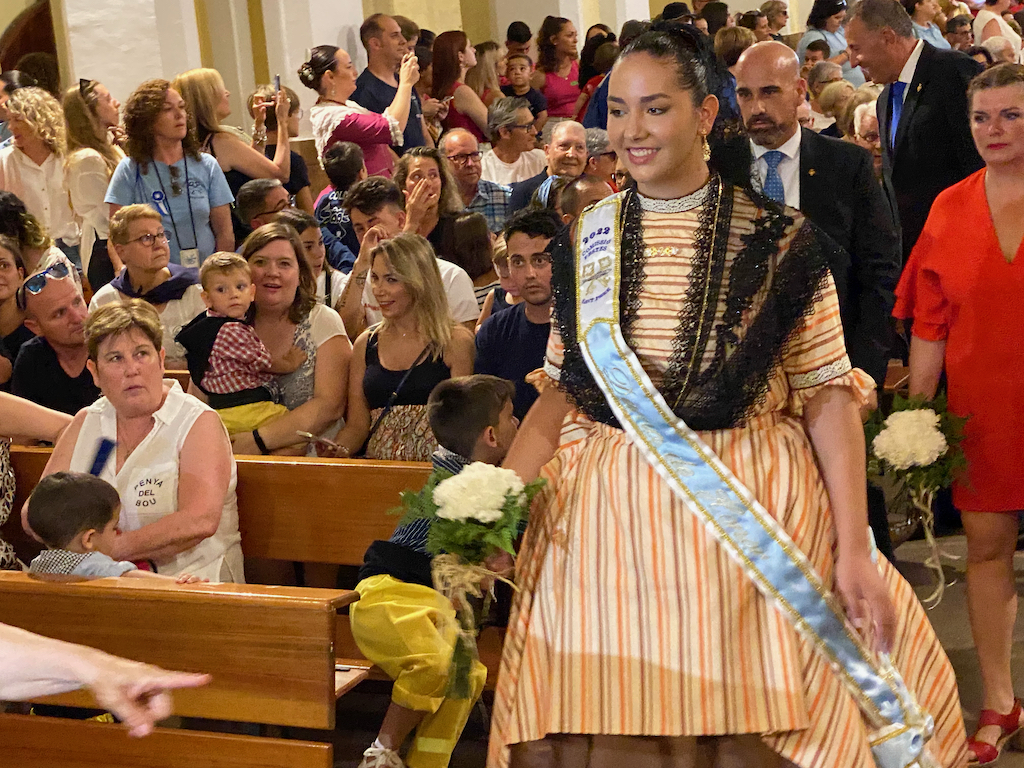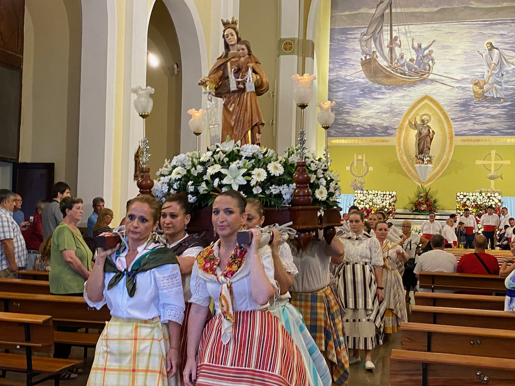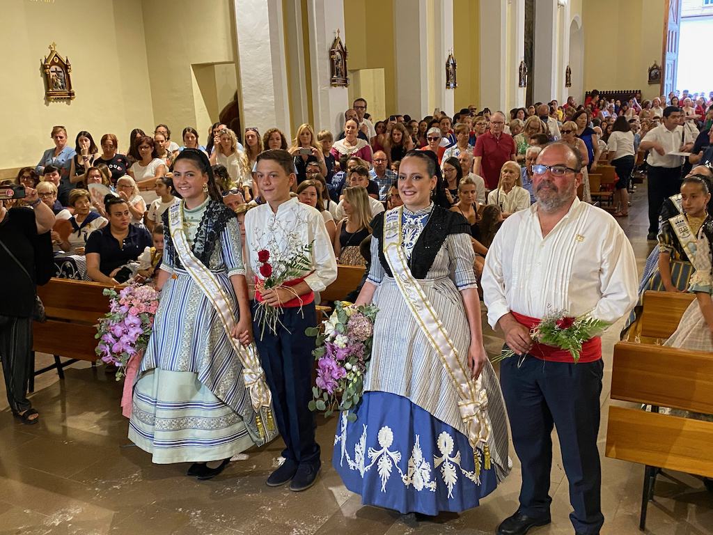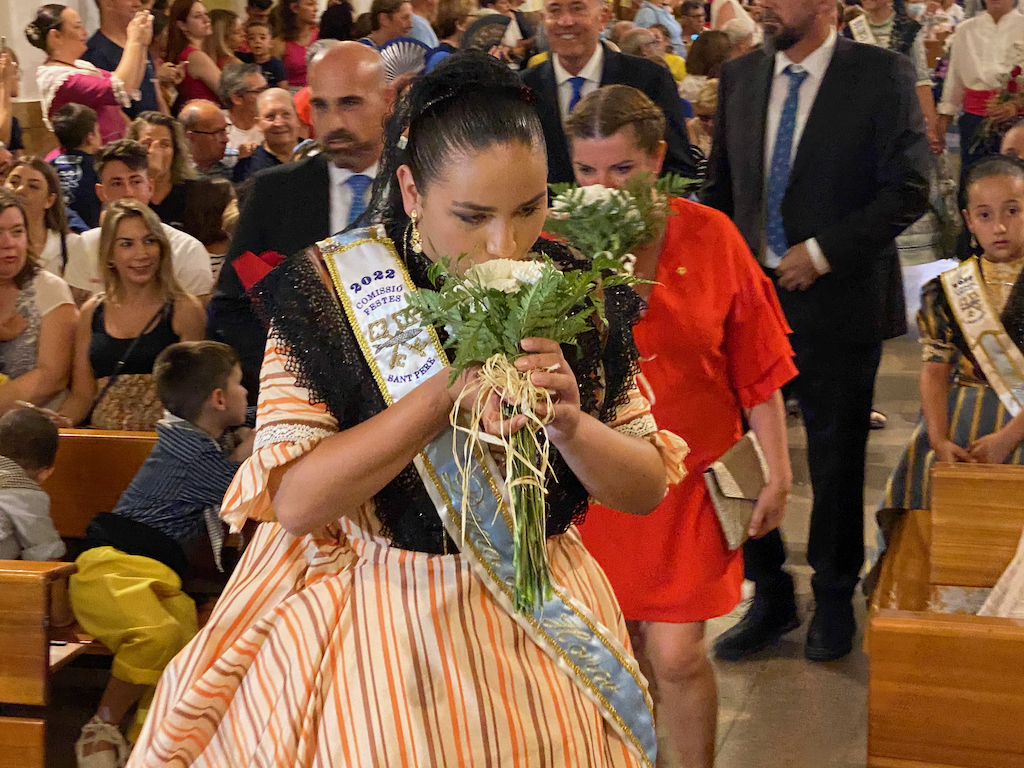 La Comitiva se desplazó desde la Tenencia de Alcaldía del Grau hasta la parroquia de Sant Pere, sonde se componían los paneles de flores dedicados al santo. Las reinas del Grau y la Comisión de fiestas besaron sus ramos de flores antes de entregarlos para confeccionar la ofrenda.
