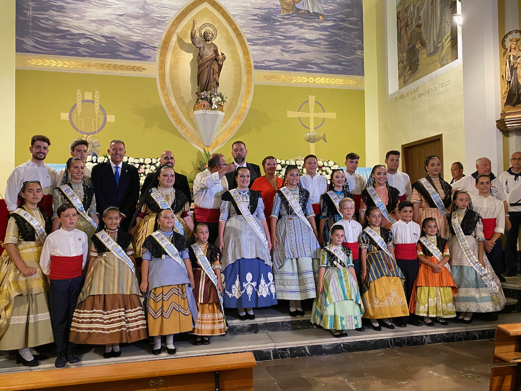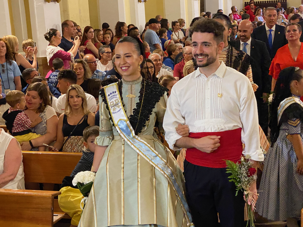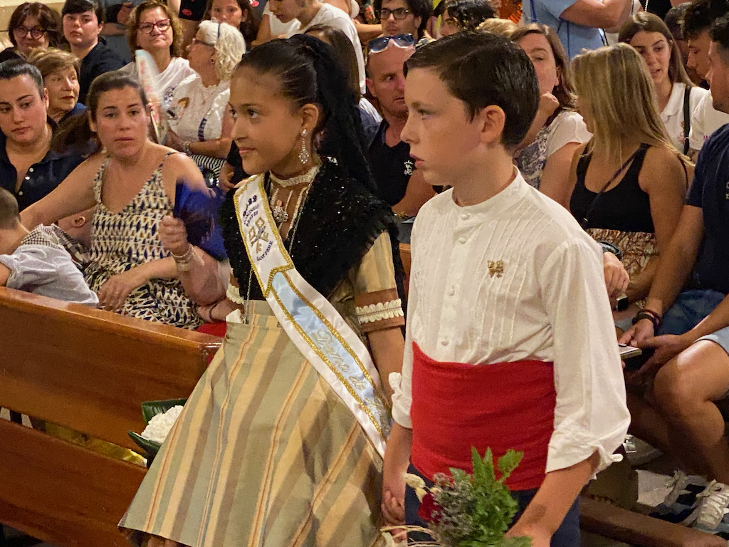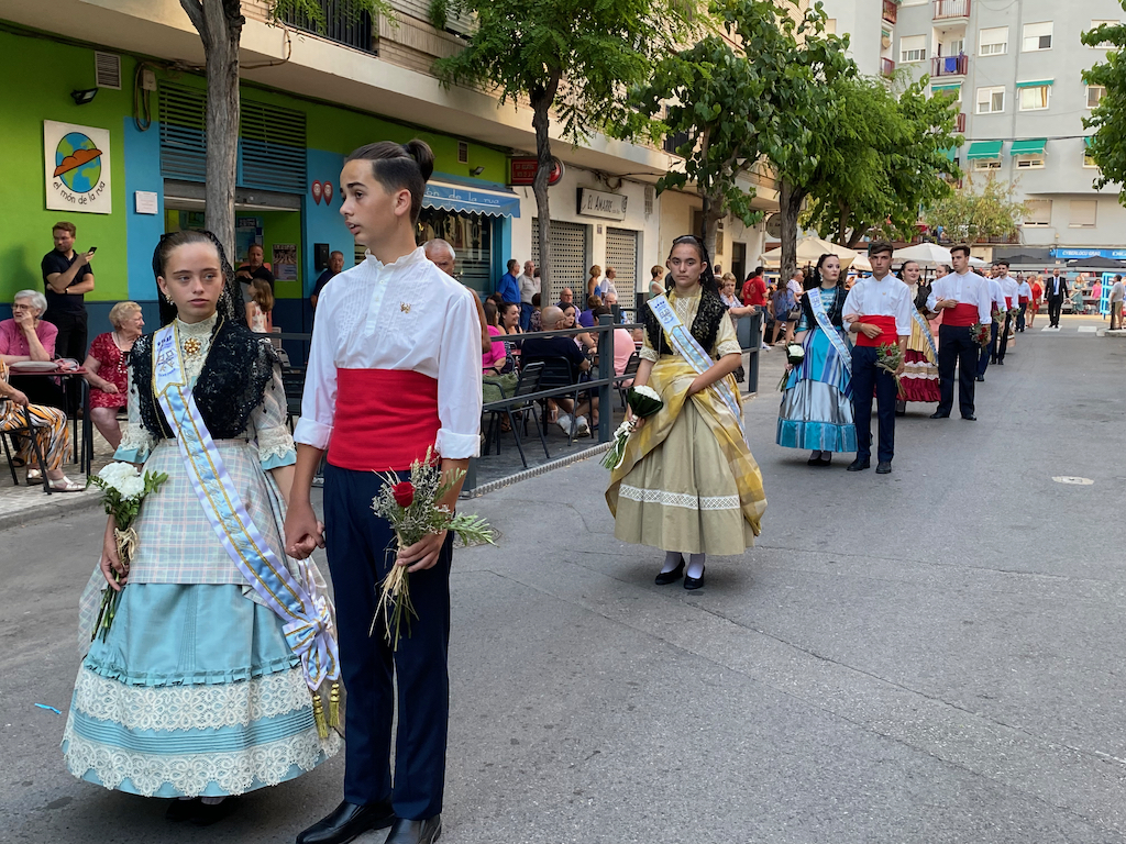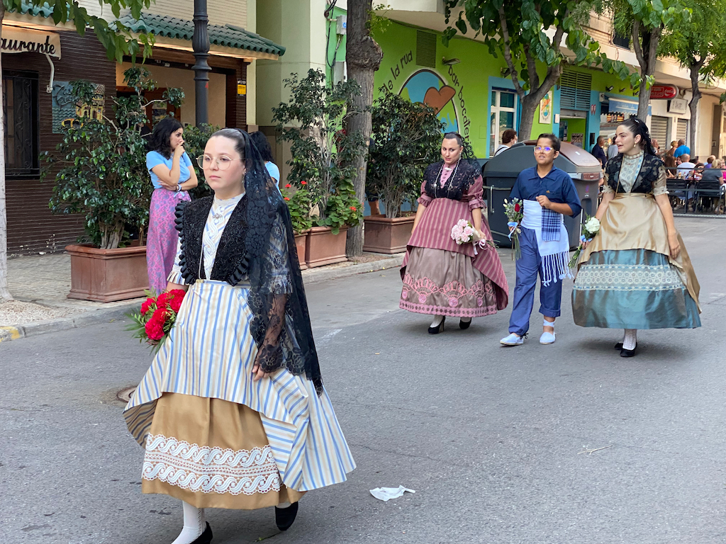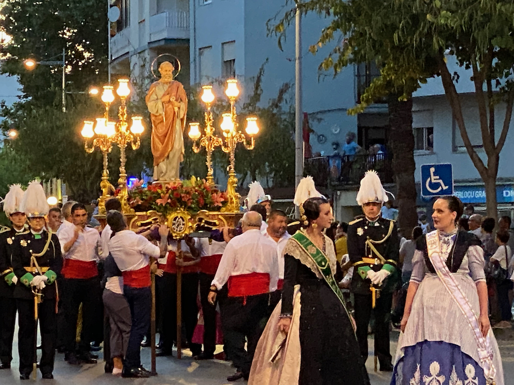 La Comitiva se desplazó desde la Tenencia de Alcaldía del Grau hasta la parroquia de Sant Pere, sonde se componían los paneles de flores dedicados al santo. Las reinas del Grau y la Comisión de fiestas besaron sus ramos de flores antes de entregarlos para confeccionar la ofrenda.